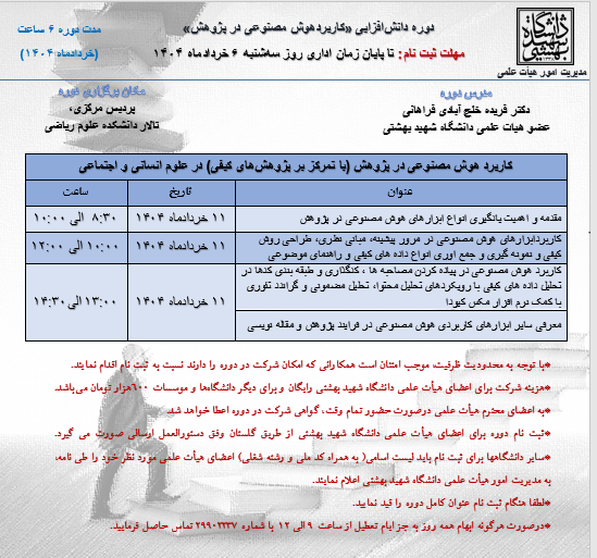 مهلت ثبتنام دوره تا پایان زمان اداری روز یکشنبه 7 اردیبهشت ماه 1404 می باشد.