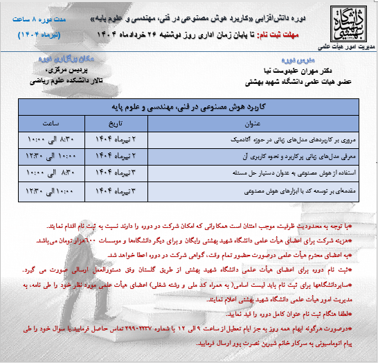 لغو برگزاری  دوره حضوری دانش‌افزایی «کاربرد هوش مصنوعی در فنی و مهندسی و علوم پایه»در تیرماه  1404